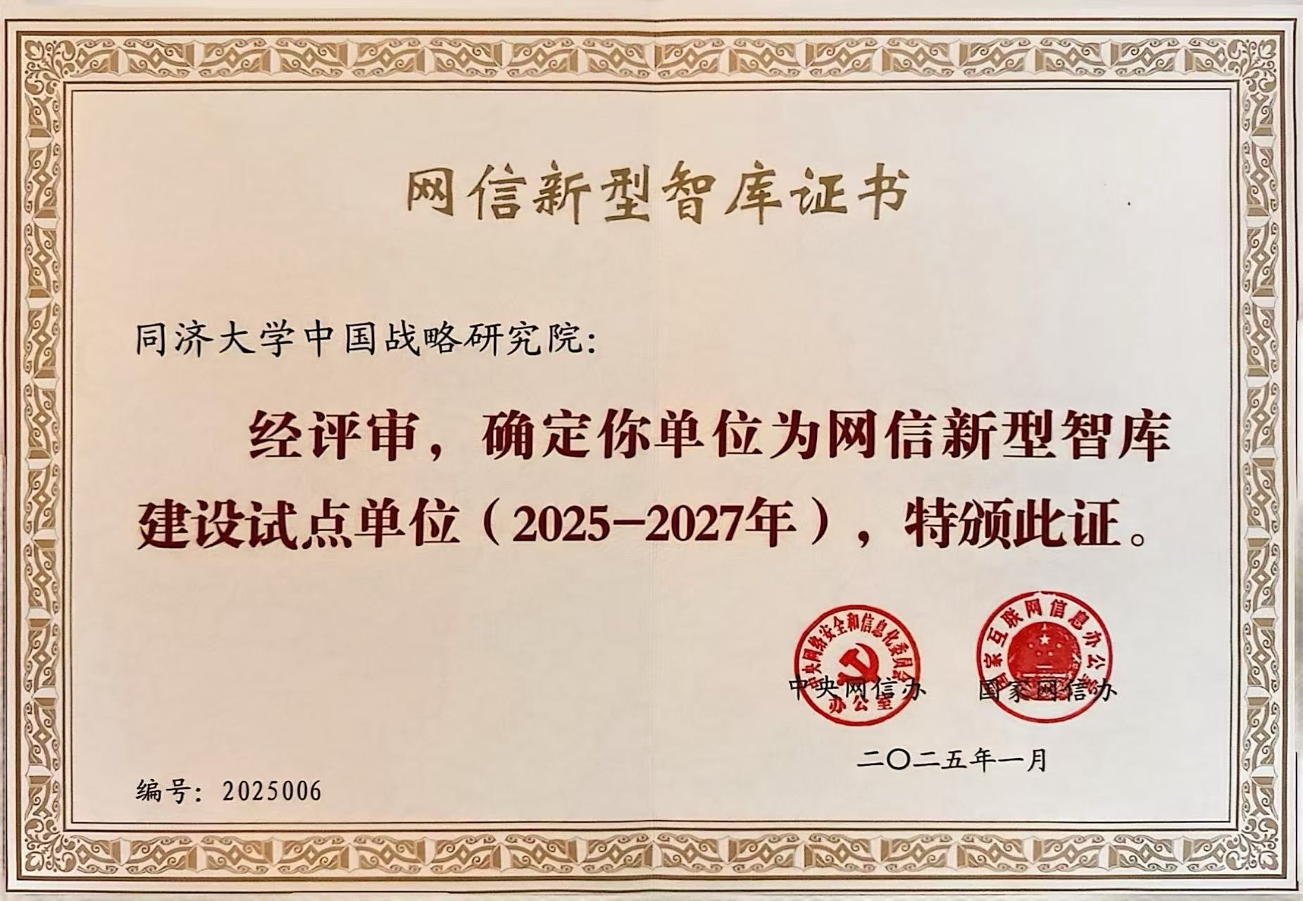 在智库平台方面,经中央网信办严格评审,同济大学中国战略研究院2025年1月入选网信新型智库建设试点单位(2025-2027年),成为20家试点单位和20家培育单位的先锋队。这是继2018年同济大学中国战略研究院入选中央网信办-教育部网络空间国际治理研究基地后再次获选,标志着中国战略研究院智库建设迈上新台阶,服务国家重大战略有了新平台。
