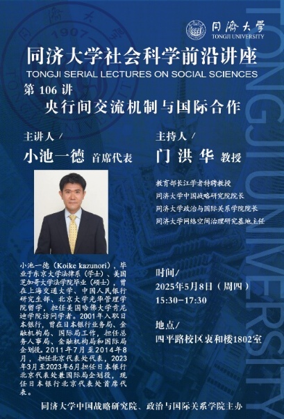 2018年4月25日,由同济大学中国战略研究院、同济大学政治与国际关系学院联合主办的“中国经济与中日经济关系的展望”主题讲座在同济大学衷和楼举办,主讲嘉宾为日本佳能全球战略研究所研究主任濑口清之研究员,同济大学中国战略研究院院长、政治与国际关系学院院长门洪华教授主持此次讲座。濑口清之研究员从目前中国的宏观经济状况、中国经济中长期的风险、中日关系和今后世界秩序的形成等方面予以了全面的解读,并详细地回答了同济师生所提出的问题。