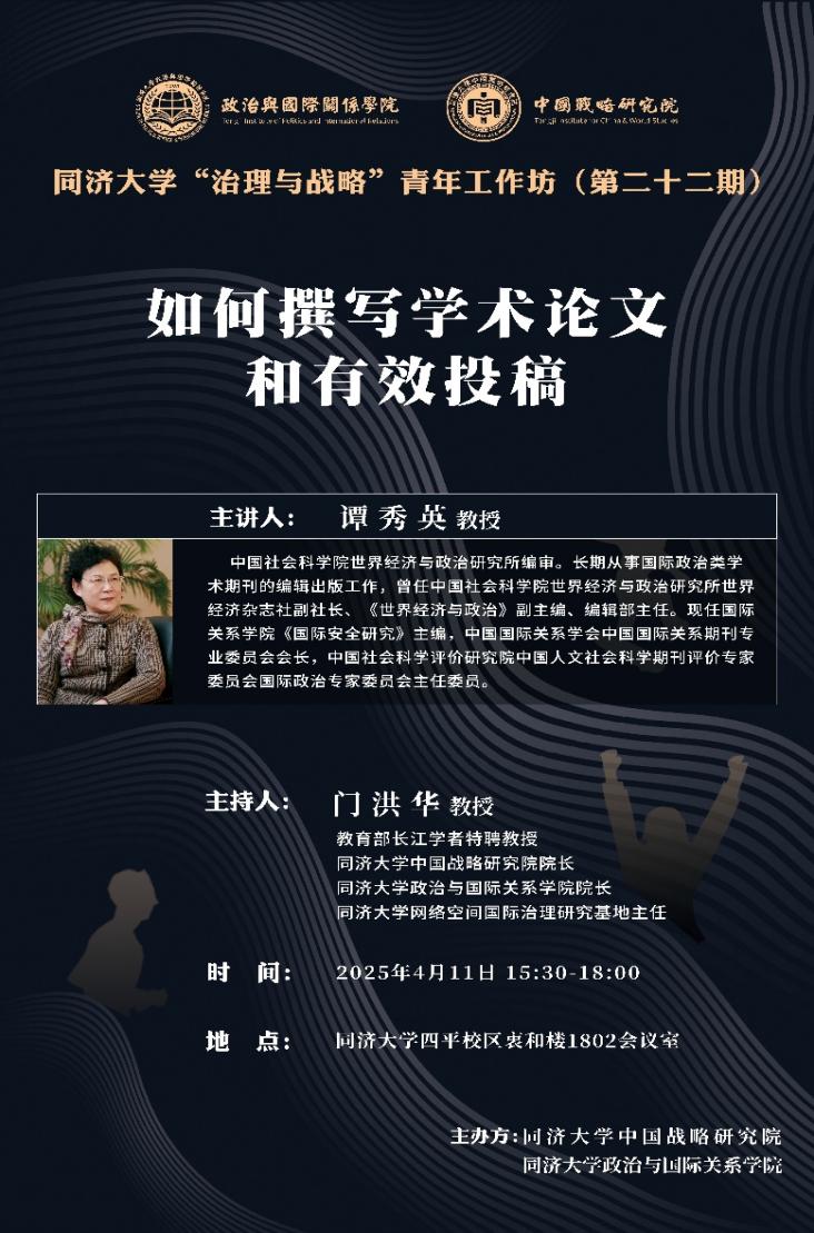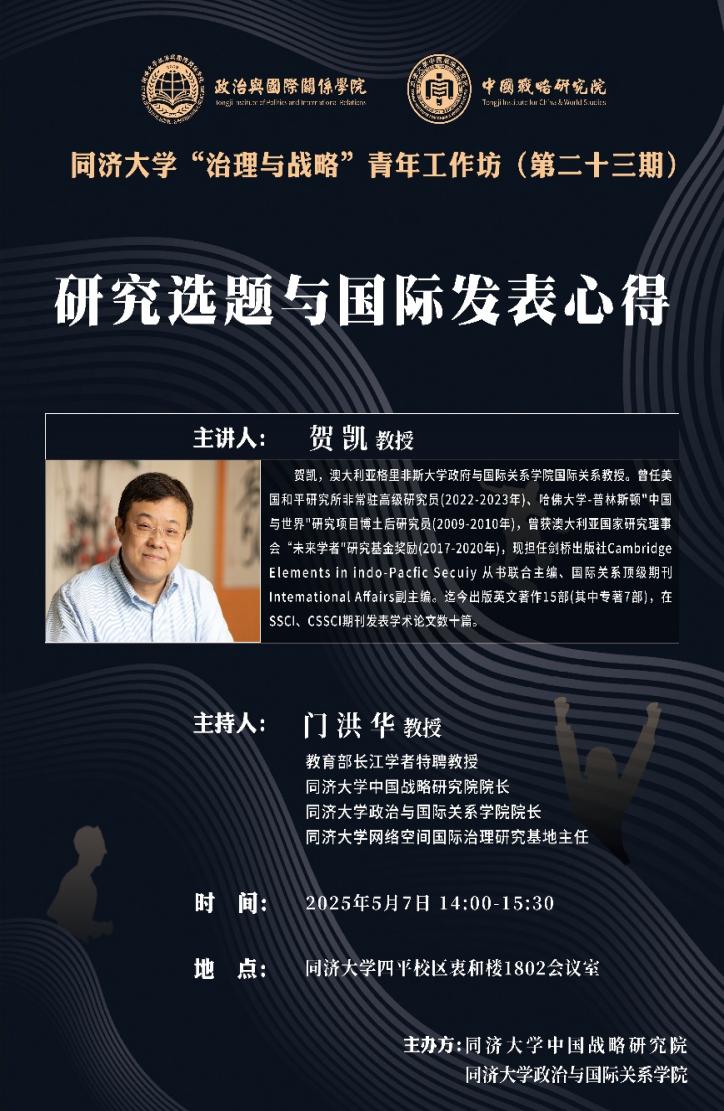 立足科研需求、对话名家主编、赋能学术求索。2025年,同济大学中国战略研究院持续举办“治理与战略”青年工作坊,通过搭建与高水平期刊编辑及国际学者的对话平台,系统强化师生论文选题与学术写作能力。4月11日,中国社会科学院世界经济与政治研究所编审、国际关系学院《国际安全研究》主编谭秀英研究员围绕“如何撰写学术论文和有效投稿”,系统讲解科研论文选题设计、学术规范和有效投稿策略。5月7日,澳大利亚格里菲斯大学治理与公共政策研究中心主任、政府与国际关系学院贺凯教授以“研究选题与国际发表心得”为主题,围绕“自身学术背景与博士求学经历”“研究选题的路径与方法”“国际关系理论创新的实践与策略”以及“学术生涯的启示与建议”四个方面展开深入讲解。