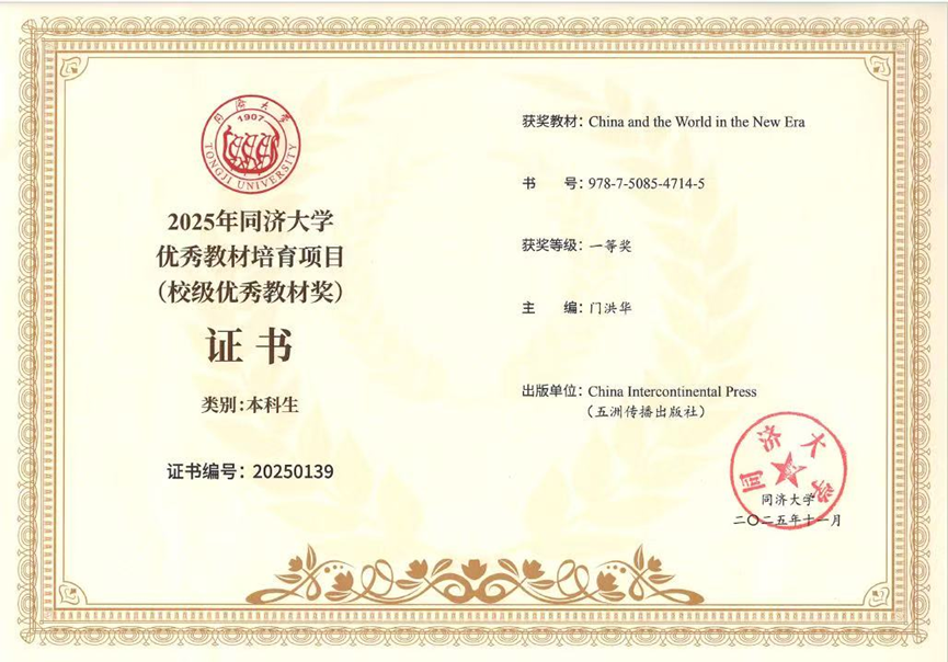 2025年12月,2025年度同济大学优秀教材奖评选结果揭晓,教育部长江学者特聘教授、同济大学中国战略研究院/政治与国际关系学院门洪华院长编写的英文教材China and the World in the New Era(书号978-7-5085-4714-5)荣获本科生教材一等奖。该教材由五洲传播出版社(China Intercontinental Press)2021年12月出版,聚焦新时代中国与世界的互动关系,既贴合本科生的知识需求,也体现了国际视野与中国立场的结合。 该教材系同济大学精品通识课程“新时代的中国与世界”的配套英文教材。