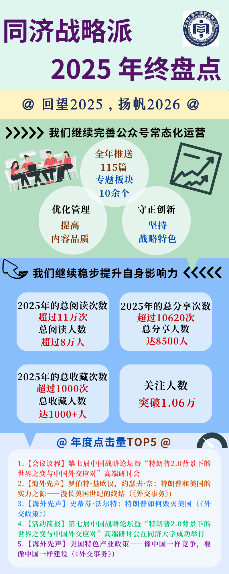 在宣传平台方面,同济大学中国战略研究院主持的“同济战略派”公众号在2025年团队不断壮大、运营稳步推进。2025年全年推送115篇文章,通过10余个专题板块坚持中国风格、彰显战略特色。据统计,2025年“同济战略派”关注人数突破1.06万人、总阅读量超过11万次、总阅读人数超过8万人、总分享次数超过1万次,总收藏次数超过1000次。回望2025年,同济战略派步履铿锵。展望2026年,同济战略派踔厉奋发,力争打造“中国本位、战略特色”的宣传平台。