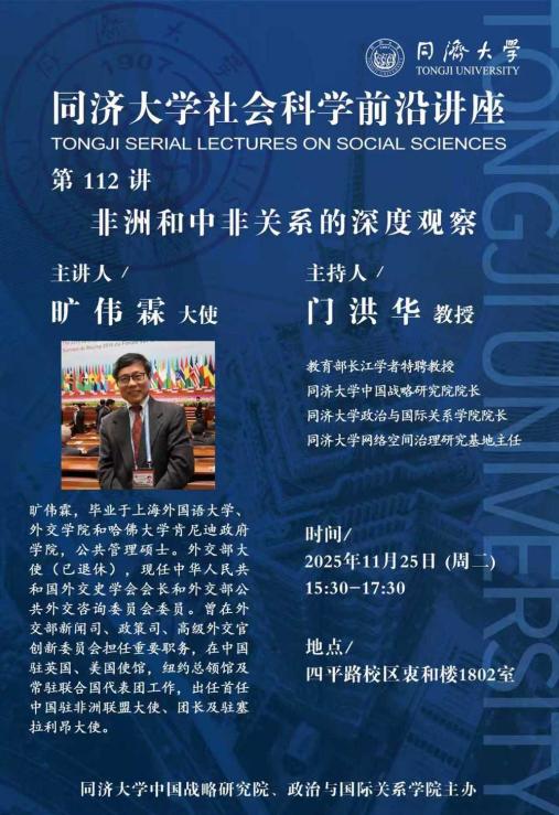 2025年,曾任政府官员、驻外大使的多位嘉宾也莅临同济大学政治与国际关系学院,为学院师生传经送宝,讲授外交一线的宝贵实践经验。10月17日,中国联合国协会原副会长兼总干事、前外交部军控司副司长刘志贤同志应邀莅临,为师生作“外交谈判:策略与技巧”专题讲座,根据自身长期外事工作中积累的丰富经验,围绕主题提出了诸多真知灼见。11月18日,国家发展改革委区域开放司原司长徐建平博士莅临同济大学作题为“共建‘一带一路’:过去、现在和未来”的讲座。徐建平司长根据自身长期深耕“一带一路”领域的丰富工作经验,围绕着“一带一路”的过去、现在和未来分享了诸多深刻洞见。11月25日,中华人民共和国外交史学会会长、原中国驻非洲联盟大使旷伟霖大使莅临学院,以“非洲和中非关系的深度观察”为题作专题讲座。旷伟霖大使基于6年多非洲工作经历和40余年的外交实践积累的丰富经验,围绕非洲发展现状、中非关系重要性、合作实践与挑战等核心议题,提出了诸多深刻见解。