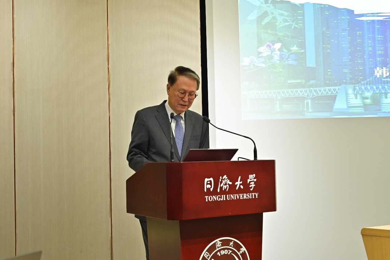 辛正承大使向同济大学对论坛的精心筹备表达衷心感谢,并向出席论坛的中韩专家致以诚挚问候。他回顾2016年起由同济大学与东西大学轮流举办的上海-釜山合作论坛的发展历程,指出其宗旨在于促进中韩地方交流合作、推动两国关系稳定发展。他认为,中韩两国作为一衣带水的邻邦,建交33年来在各领域取得丰硕合作成果,但也面临外部环境变化所带来的机遇与挑战,而上海与釜山结好三十余年的交流亦需深化拓展。为此,他期待本届论坛能坦诚探讨中韩关系的发展路径,深化上海与釜山的务实合作。