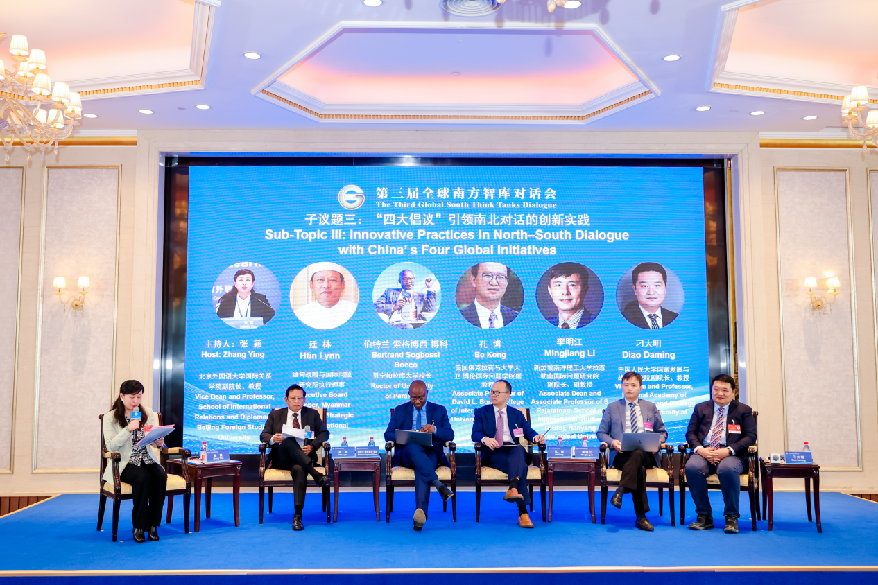 子议题三“‘四大倡议’引领南北对话的创新实践”聚焦中国提出的全球发展倡议、全球安全倡议、全球文明倡议和全球治理倡议在重塑合作模式中的制度价值。本议题由北京外国语大学国际关系学院副院长张颖教授主持,缅甸战略与国际问题研究所执行理事廷林,贝宁帕拉库大学校长伯特兰·索格博西·博科,美国俄克拉荷马大学大卫·博伦国际问题学院孔博副教授,新加坡南洋理工大学拉惹勒南国际问题研究院副院长李明江副教授,中国人民大学国家发展与战略研究院副院长刁大明教授等嘉宾出席并发言。专家们普遍认为,“四大倡议”从理念到路径为破解发展赤字、安全赤字与信任赤字提供了系统性方案,有助于推动南北关系从“施予-受援”逻辑转向基于主权平等、多元共存和共同安全的伙伴关系,拓展全球南方在全球治理体系中的制度性参与空间。多位嘉宾从区域合作和机制设计角度分析了倡议的落地效果,认为应在基础设施互联互通、区域一体化、规则共建等领域形成更多可复制的实践范例。