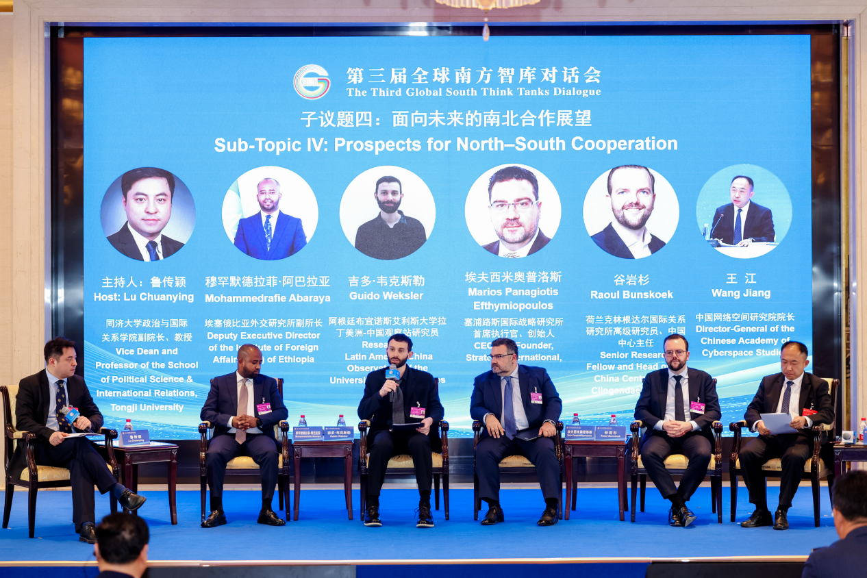 子议题四“面向未来的南北合作展望”围绕全球治理变革背景下的前瞻性议程展开。本议题由同济大学政治与国际关系学院副院长鲁传颖教授主持,埃塞俄比亚外交研究所副所长默罕默德拉菲·阿巴拉亚,阿根廷布宜诺斯艾利斯大学拉丁美洲-中国观察站研究员吉多·韦克斯勒,塞浦路斯国际战略研究所首席执行官兼创始人埃夫西米奥普洛斯,荷兰克林根达尔国际关系研究所高级研究员、中国中心主任谷岩杉,中国网络空间研究院院长王江等嘉宾出席并发言。与会专家普遍认同,多极化和新一轮科技革命正在重塑国际合作结构,为南北协同创造前所未有的战略机遇,但在地缘政治竞争加剧和治理碎片化趋势下,如何维护合作意愿与制度稳定,是未来国际合作能否走向可持续的关键。嘉宾们呼吁在国际制度改革、能力建设、绿色与数字转型、风险治理等重点领域形成协调的全球行动框架,通过知识网络、智库联盟和“认知外交”等方式,推动不同发展阶段国家实现优势互补与共同进步。