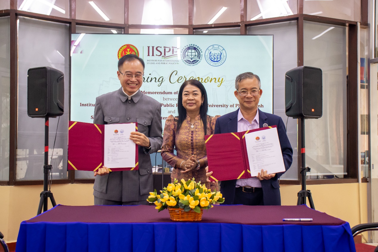 1月13日下午,同济大学代表团赴柬埔寨金边皇家大学访问,门洪华院长和金边皇家大学国际研究与公共政策学院院长尼克·占达利(NEAK Chandarith)教授代表两校签署合作备忘录,金边皇家大学副校长欧姆·拉维(OUM Ravy)教授见证,中国驻柬埔寨大使馆参赞王志全、柬埔寨首相办公室副国务秘书LAO Meng、柬埔寨公共工程与运输部顾问何树林、柬埔寨参议院第二副主席办公室副主任索恩·波夫(SORN Pov)、中国和平发展基金会柬埔寨办事处主任王亚辉等出席签约仪式。