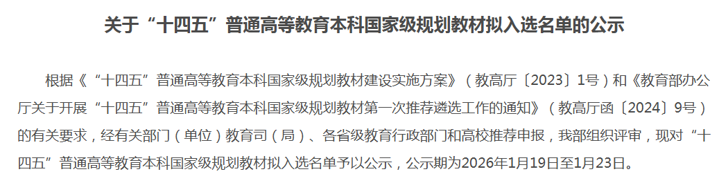 据悉,“十四五”普通高等教育本科国家级规划教材遴选,是教育部深化教育教学改革、落实立德树人根本任务、构建高质量高等教育教材体系的关键举措。本次公示的名单中,共有3404种各类教材拟入选。
