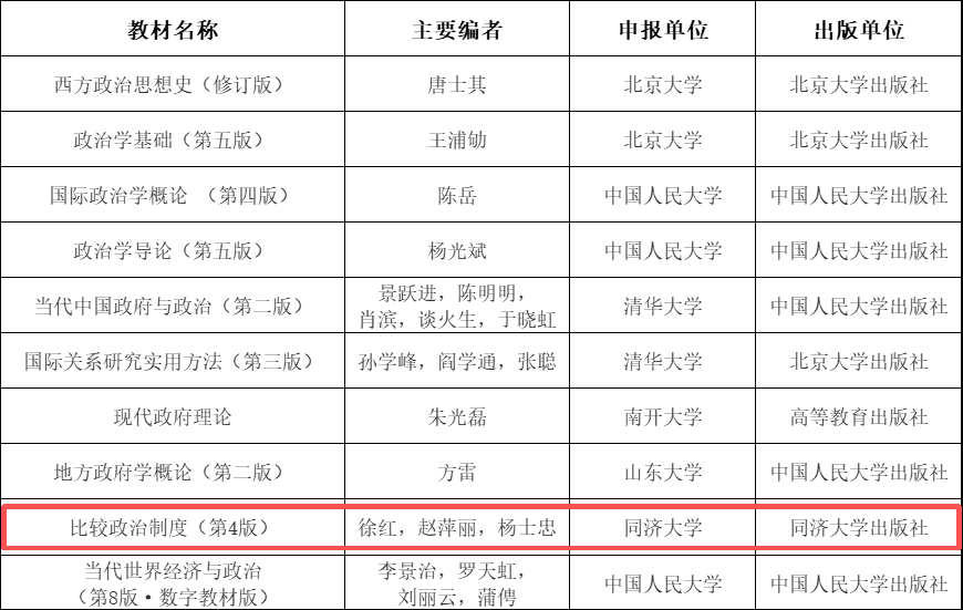 根据《教育部办公厅关于开展“十四五”普通高等教育本科国家级规划教材第一次推荐遴选工作的通知》(教高厅函[2024]9号)的有关要求,经有关部门(单位)教育司(局)、各省级教育行政部门和高校推荐申报,教育部组织评审,近日对“十四五”普通高等教育本科国家级规划教材拟入选名单予以公示。其中,同济大学政治与国际关系学院徐红教授、赵萍丽副教授、杨士忠讲师编著的《比较政治制度》(第4版)成功入选。这一成果是对我院多年来积极推进本科和研究生教材建设的一次充分肯定,也是对徐红教授等老师多年来深耕本科教学,在长达21年的时间里实现《比较政治制度》本科教材从初版到第四版不断创新的最好激励。